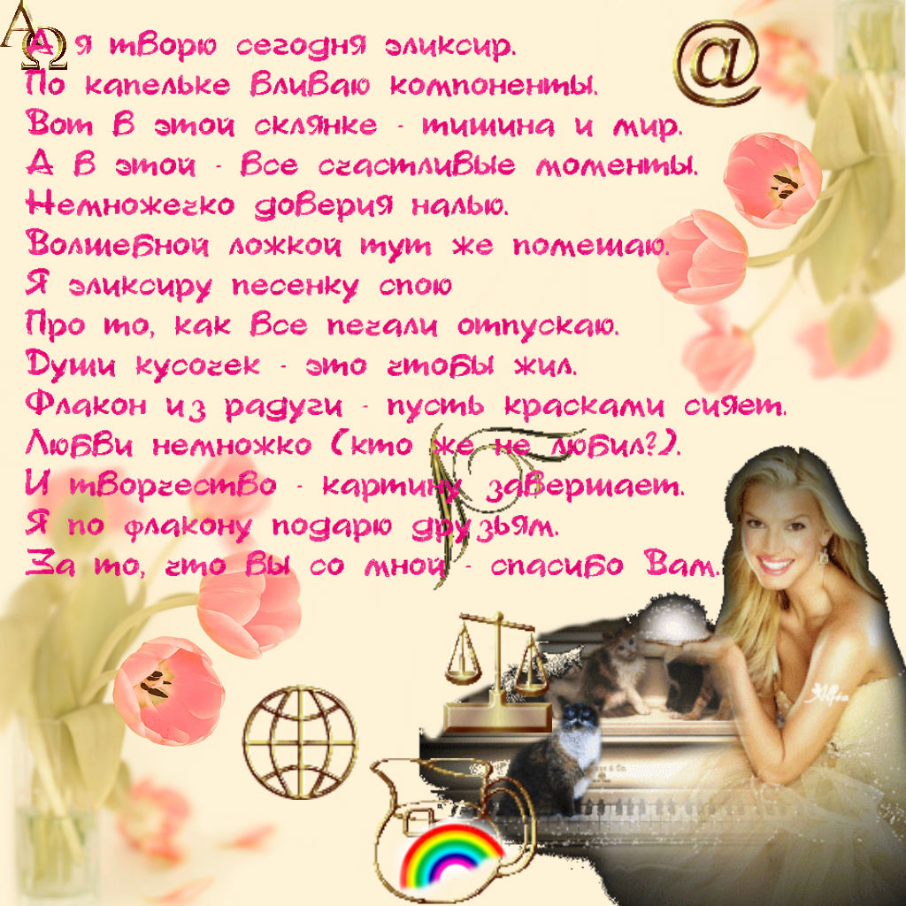 Плейкаст «ЭЛЕКСИР ДЛЯ ДРУЗЕЙ.»Беспредельно волшебными силами, Что внушают друг другу: «живи!»,Мы становимся эликсирами,Эликсирами вечной любви.Слишком многим под шелка одеждами Дорожим, без терпенья: «сорви!».Мы друг друга питаем надеждами – Эликсирами вечной любви.Слишком много сближает похожее,Только крикни и лишь позови.Остужаем друг друга мороженым –Эликсирами вечной любви.И под самыми страшными пытками Мы не внемлем призывам: «порви!»:..