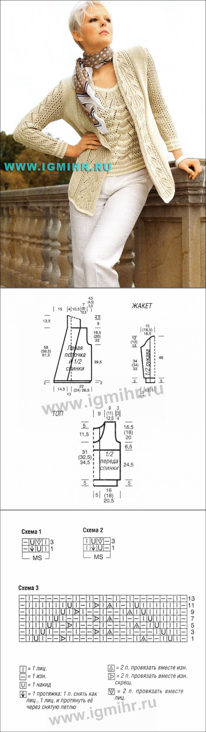 Роскошная кремовая двойка во французском стиле: топ и жакет с ажурной каймой. Спицы