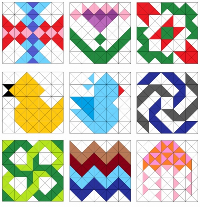 Образцы лоскутных блоков с использованием квадратов и треугольников.