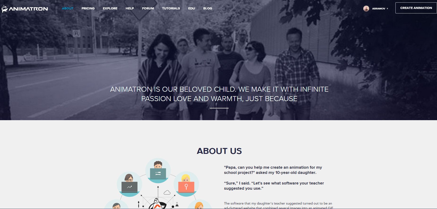 The software that my daughter’s teacher suggested turned out to be an ad-cluttered website that combined several images into an animated GIF. Not exactly the best tool for learning and creating real animation ... That's how the idea for Animatron was born: a powerful and user-friendly website that allows you to animate right in your browser and collaborate with your friends or colleagues in real time. - Dmitry Skavish, cofounder and CEO