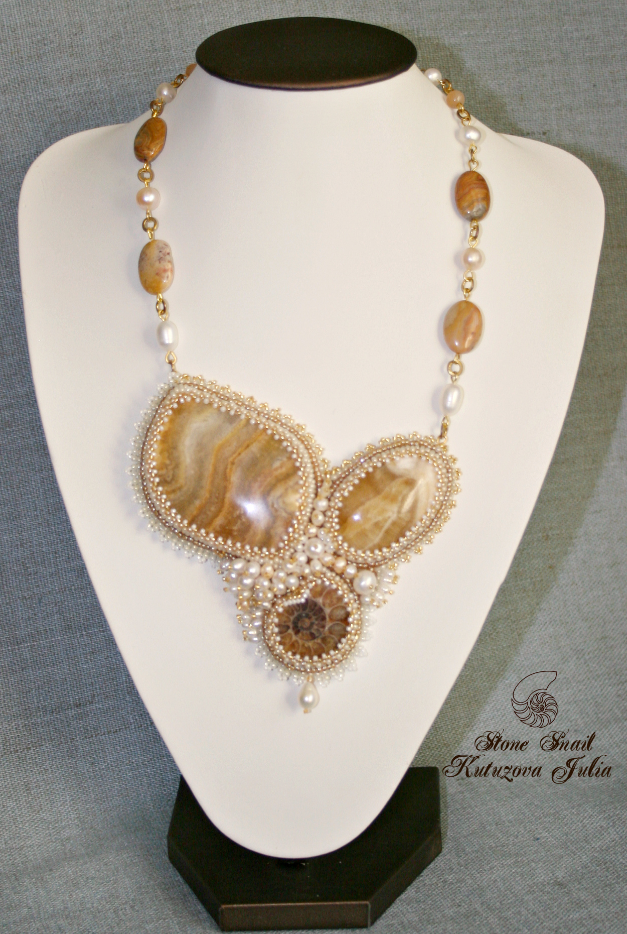 Колье вышито чешским и японским бисером. Использовались замечательные камни :агат,оникс и аммонит. Дополнил колье натуральный жемчуг. Изделие подшито натуральной кожей. Длина по внутренней стороне около 45 см. размер вышитой центральной части около 11х11см