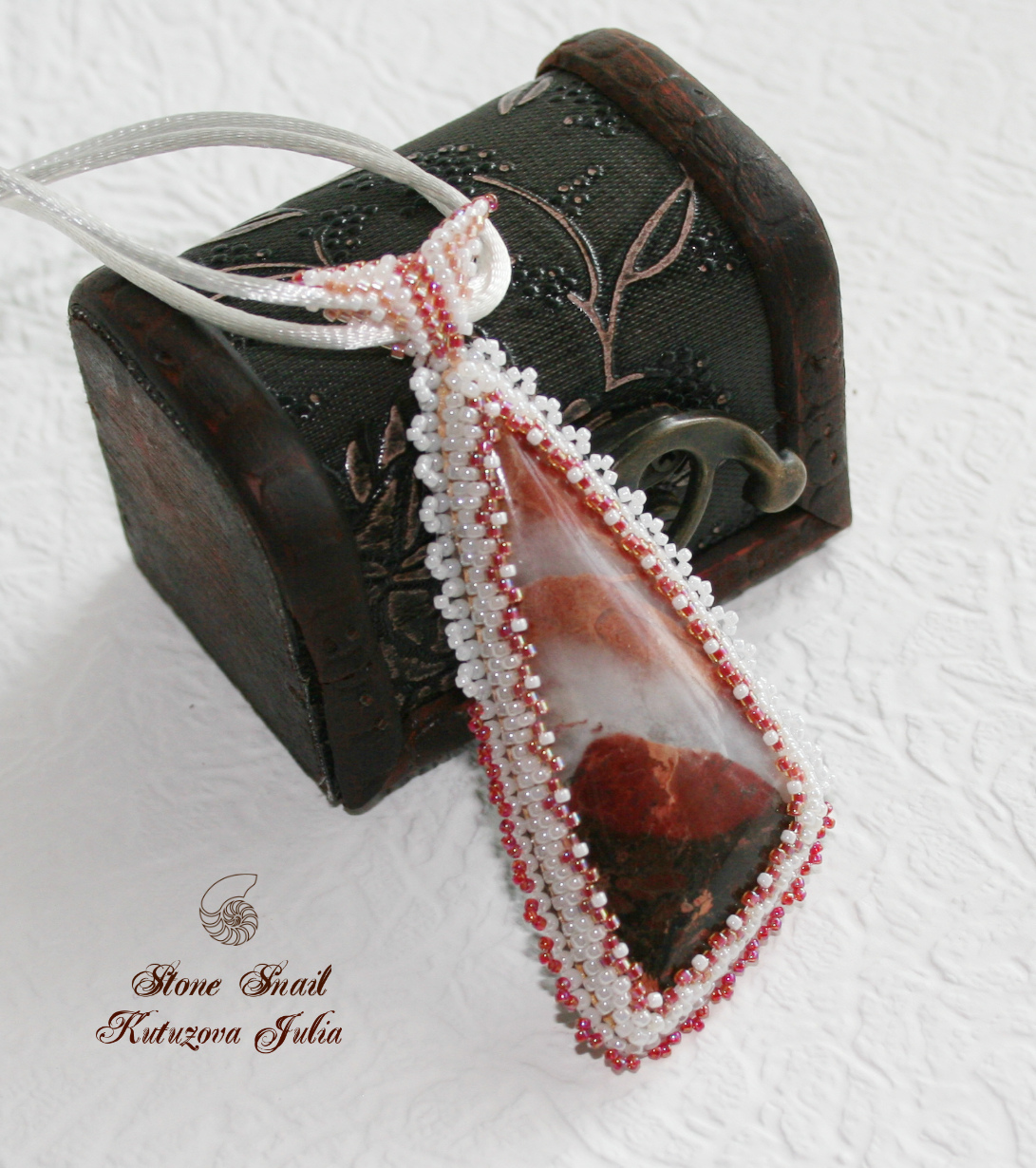 Кулон с натуральной яшмой, обшит японским бисером, с обратной стороны подшит кожей.