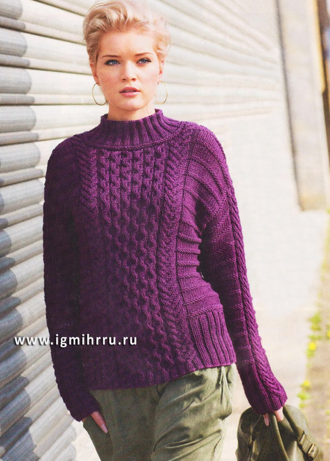 Микс выразительных узоров. Теплый фиолетовый пуловер. Спицы