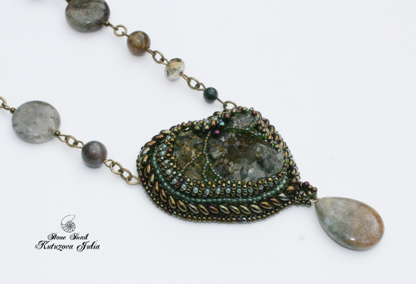 Кулон "Сораксан" с использованием друзы дымчатого кварца, бусин агата и бусин из чешского стекла. Вышит чешским и японским бисером.