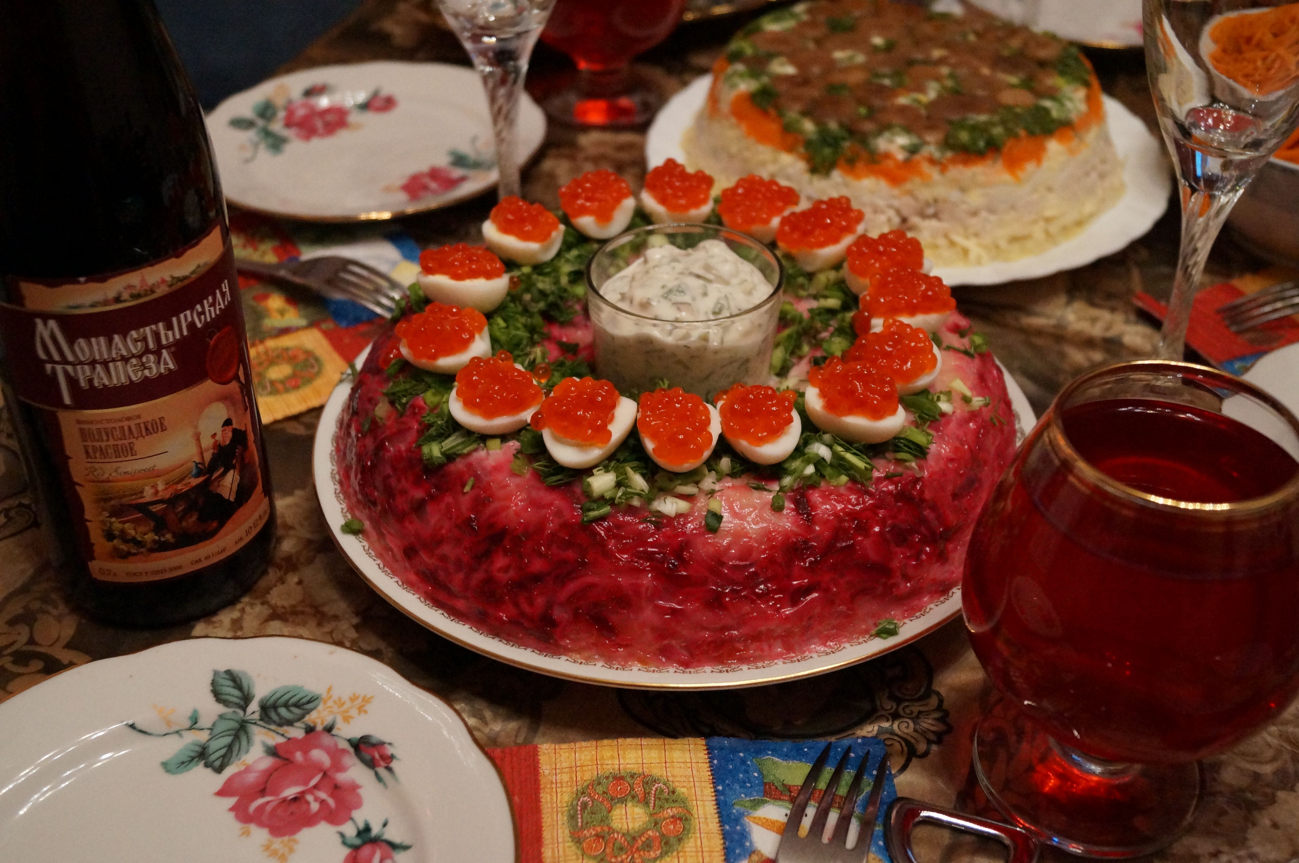 Рыбный салат с соусом тартар. Ставим на блюдо стакан, через тёрку слоями вокруг стакана - слой отварного картофеля, слой варёных яиц, майонез, морковь, солёная скумбрия порезанная мелким кубиком, солёный огурец, лук репчатый мелко порезанный, майонез, свекла варёная, майонез, картофель, майонез, зелень. Сверху варёные перепелиные яйца, красная икра. Аккуратно достаём стакан из центра, ставим на его место стакан с соусом тартар. Эффектно?