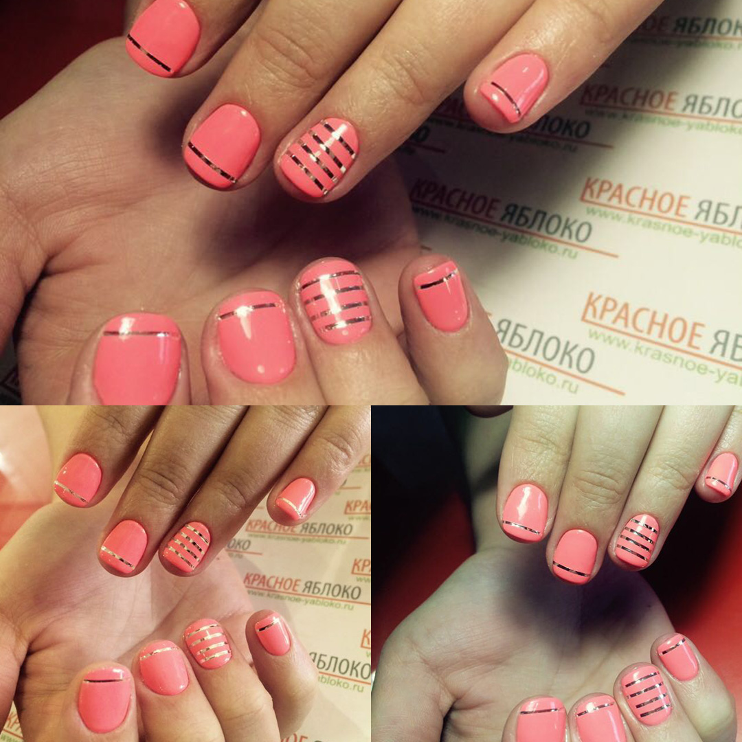 Коралловый маникюр с золотистыми полосками на короткие ногти от мастера, мастер Наталья Стоянова ⓂВыхино Ждем вас ежедневно с 10.00 до 22.00. Все салоны находятся в шаговой доступности от метро.