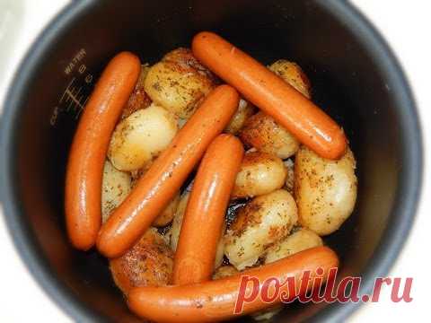 Молодой картофель запеченный с сосисками в мультиварке (два блюда одновременно)