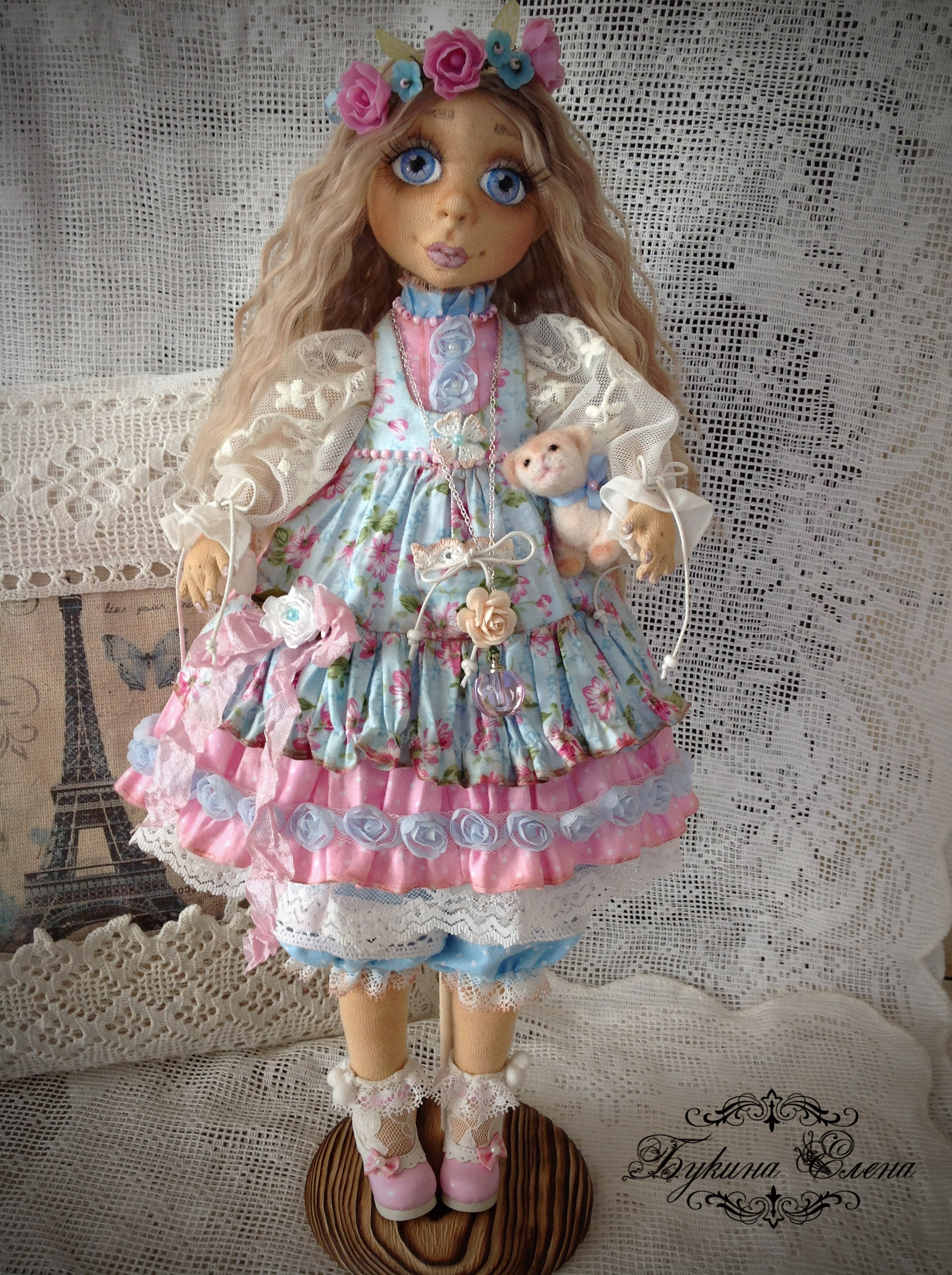 Катеринка, коллекционная текстильная куколка.Выполнена в стиле шебби-шик. Полностью подвижная, голова крутится и наклоняется. Ножки сгибаются, в руках проволочный каркас, каждый пальчик гнется. Волосы искусственные трессы, приближены к натуральным, можно завивать и укладывать в прически. Вся одежда съёмная.На голове веночек с цветами из полимерной глины, сделан мною.На шее висит арома-кулончик, можно добавить любимый Вами аромат.В руках котёнок, свалян из натуральной шерсти.Рост 41 см.
