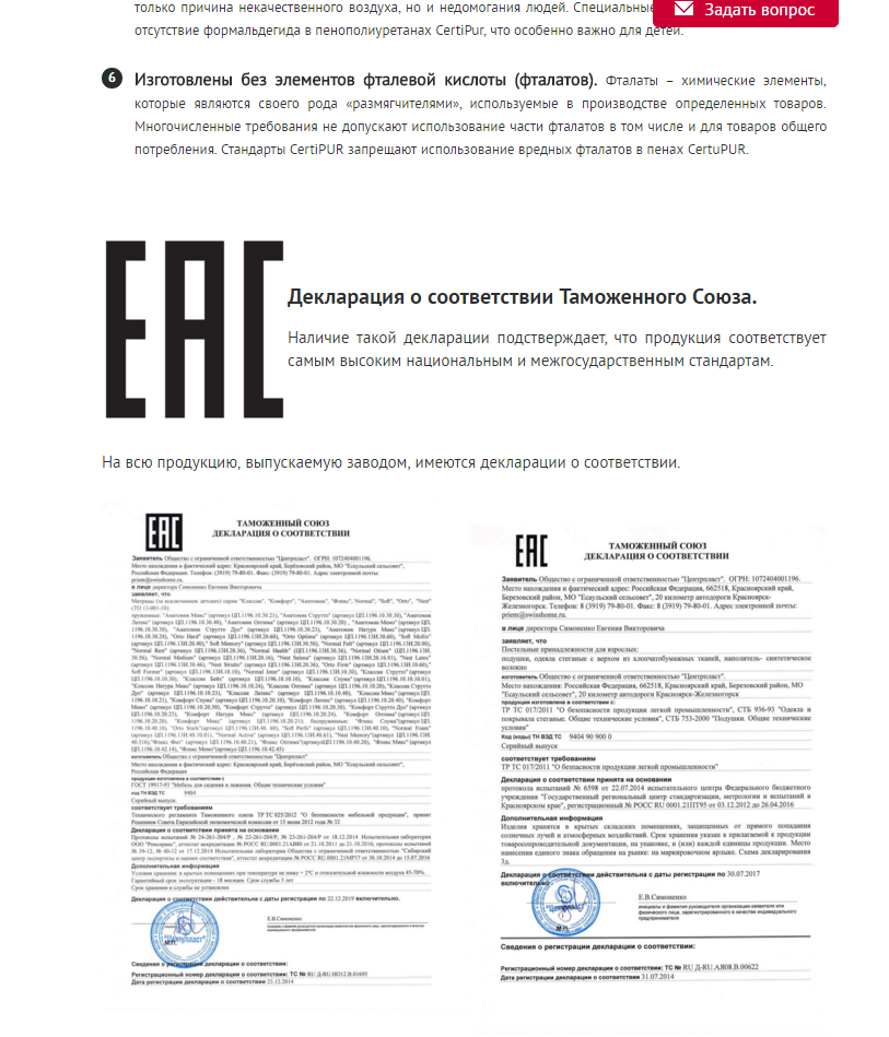 Сертификаты, эксплуатация и уход за ортопедическими матрасами - Интернет-магазин ортопедических матрасов Swisshome СМ: ФТАЛАТЫ и СЕРТИФИКАТЫ ЕАС 20160405АЛ