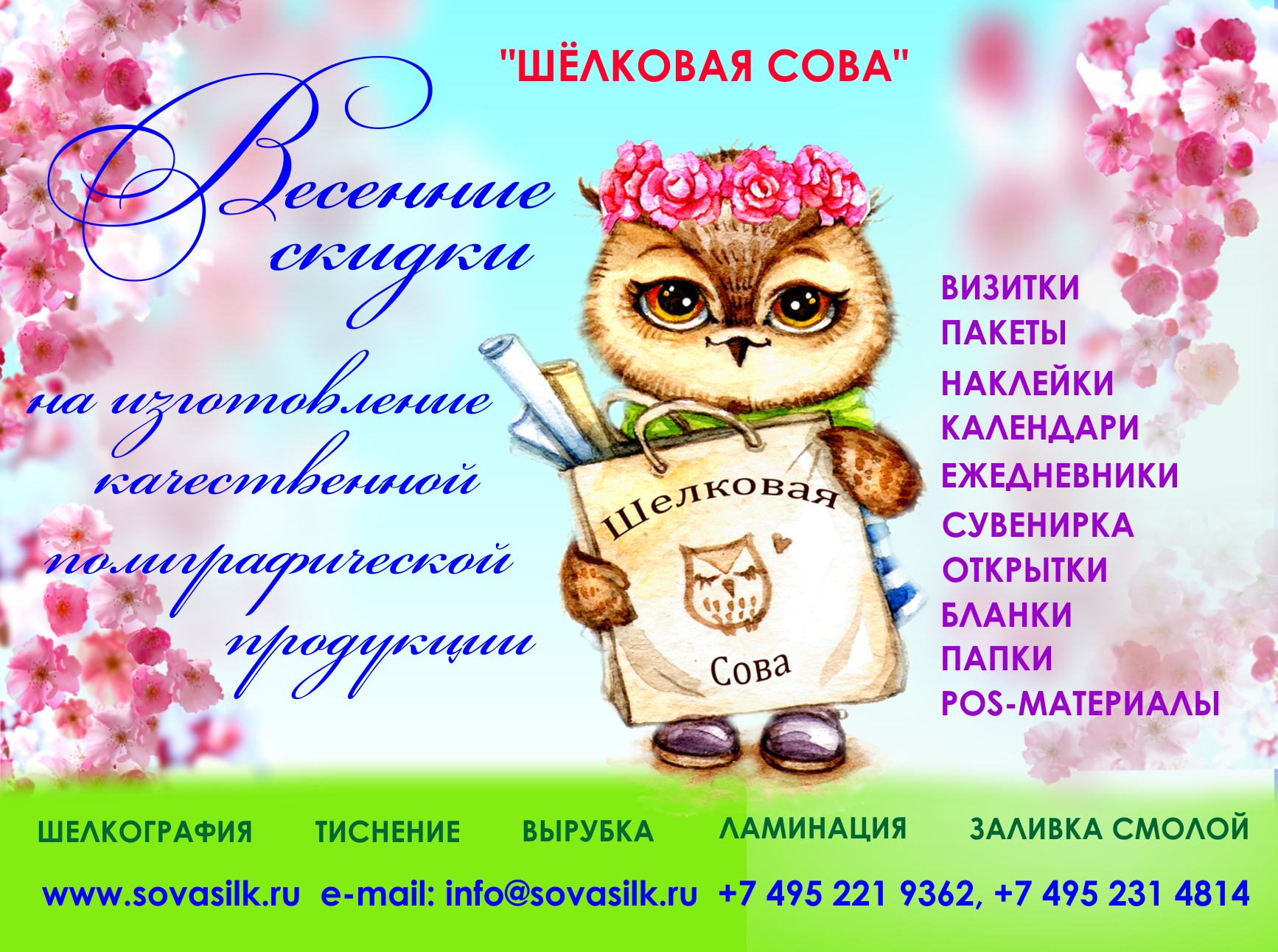Рады видеть ВАС на нашем сайте Деловое сотрудничество начинается с обмена визитками. Корпоративная переписка с заключением солидных контрактов – с написания писем на качественных фирменных бланках. Выставка – с яркой подачи продукции или услуг с помощью грамотно разработанных рекламных материалов. А стремительное продвижение вашей фирмы на деловом рынке – с сотрудничества с рекламно-полиграфической компанией «Шёлковая Сова». От визиток до разработки рекламных кампаний: весь спектр услуг для