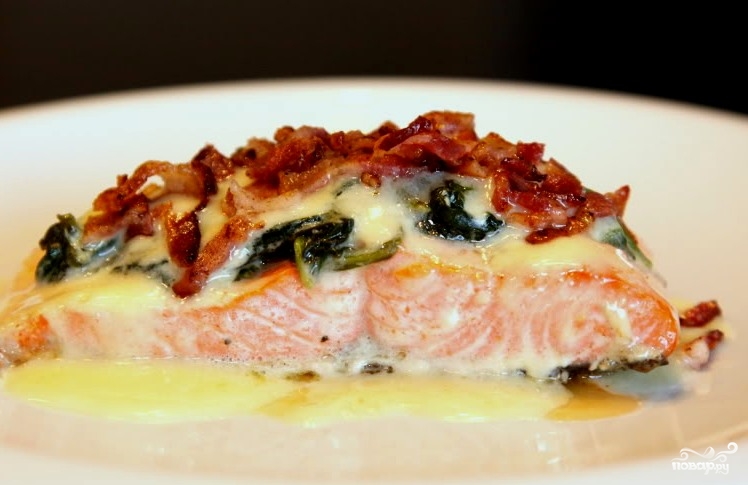 - Семга - очень вкусная и полезная рыба. Готовить блюда из нее очень легко. Я предлагаю немножечко усложнить задачу и приготовить вкуснейшее блюдо из этой рыбки с сыром и некоторыми дополнительными ингредиентами. Рассказываю, как сделать семгу под сыром. Но не просто под сыром, а с прослойкой из шпината. Кто не любит шпинат - просто пропустите этот этап готовки. А в дополнение к рыбе - вкусный соус. Готовим? 1. Помыть семгу и разделать на 2 филе. Если у вас филе - просто разрежьте его. Смешать 2 щепотки соли и молотый перец и этой смесью натереть рыбку, пусть полежит минут 15, промаринуется. 2. Шпинат вымыть, мелко нарезать. Чеснок очистить и мелко-мелко нарезать. Бекон нарезать мелкими кубиками. Сыр натереть на терке. 3. Обжарить на растительном масле бекон и убрать его со сковородки. На оставшемся масле слегка обжарить чеснок, а затем выложить в него нарезанный шпинат и притушить до мягкости. Добавить соль. 4.Обжарить на разогретой сковороде-гриль семгу с обеих сторон по 3-4 минуты. 5. Выкладываем обжаренную рыбу в форму для запекания, слегка смазанную маслом. Поверх рыбки выкладываем шпинат, затем натертый сыр и обжаренные кусочки бекона. 6. В разогретой до 180 градусов духовке запекаем минут 15. Как раз будет время для приготовления соуса:) 7. Вообще-то рыбу уже можно подавать, но я предлагаю приготовить к ней вот такой соус. В небольшом сотейнике или сковородке выпарим вино с лимонным соком, чтобы жидкость уменьшилась наполовину. Добавим сливки, щепотку соли и масло. Уменьшаем огонь до минимального и вилкой хорошо размешиваем минуты 3, пока соус не станет однородным. Полейте этим соусом рыбу и угощайтесь:)