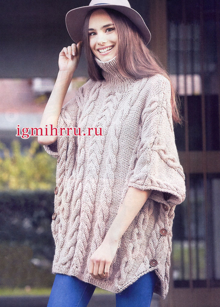 Бежевое объемное пончо-свитер с косами и боковыми застежками на пуговицы. Вязание спицами