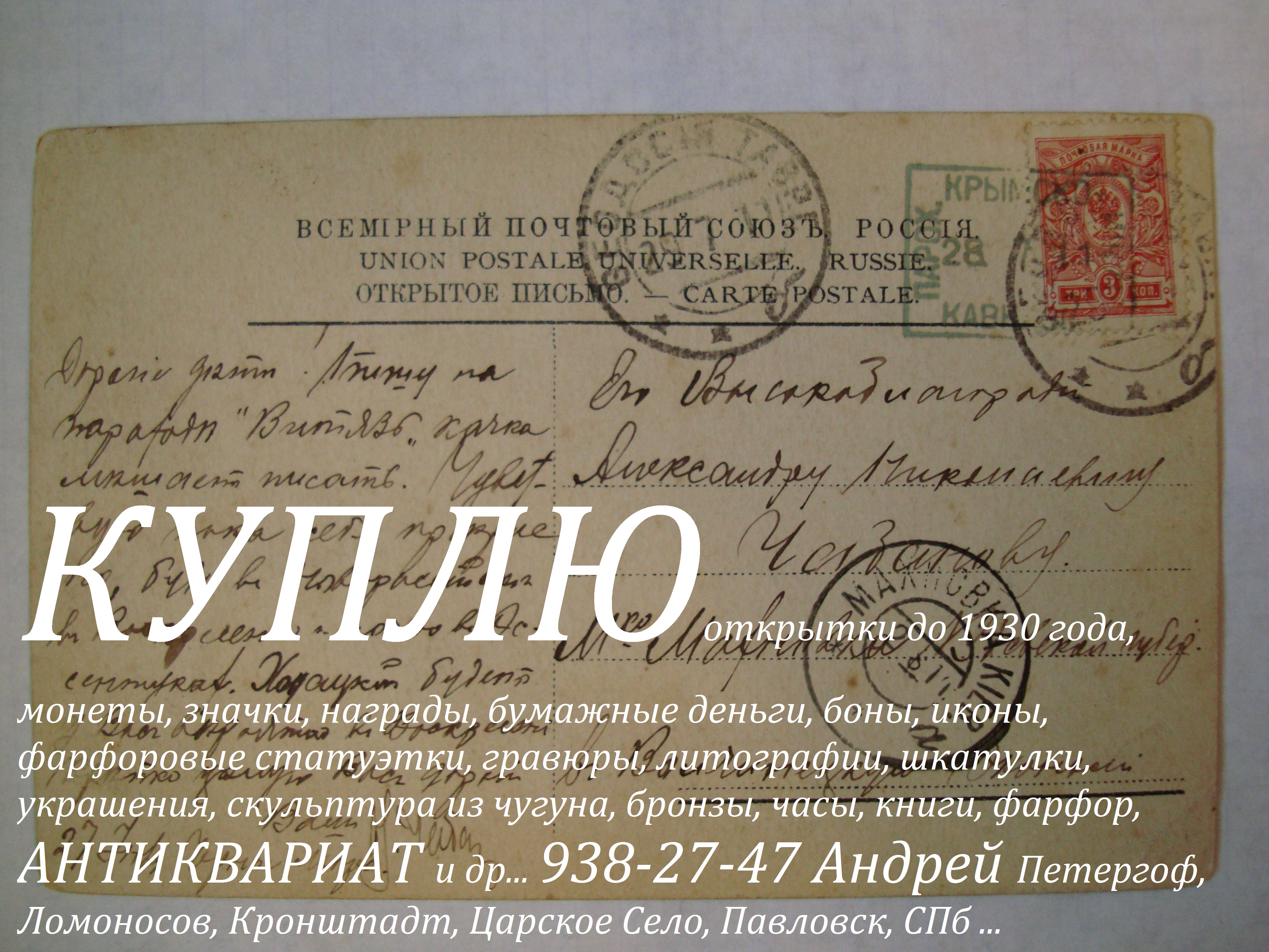 КУПЛЮ почтовые открытки до 1930 года. Монеты рубли серебряные золотые медные России иностранные юбилейные награды ордена медали Нагрудные знаки значки боны бумажные деньги купюры банкноты акции облигации царские ссср вымпел знамя часы карманные каминные столовое серебро ложки вилки ножи кресты иконы шкатулки портсигар подстаканник ювелирные украшения брошки бусы из янтаря кольцо браслет кулон перстень серьги запонки напёрсток книги фарфоровые статуэтки 938 27 47 Андрей Ломоносов СПБ Петергоф