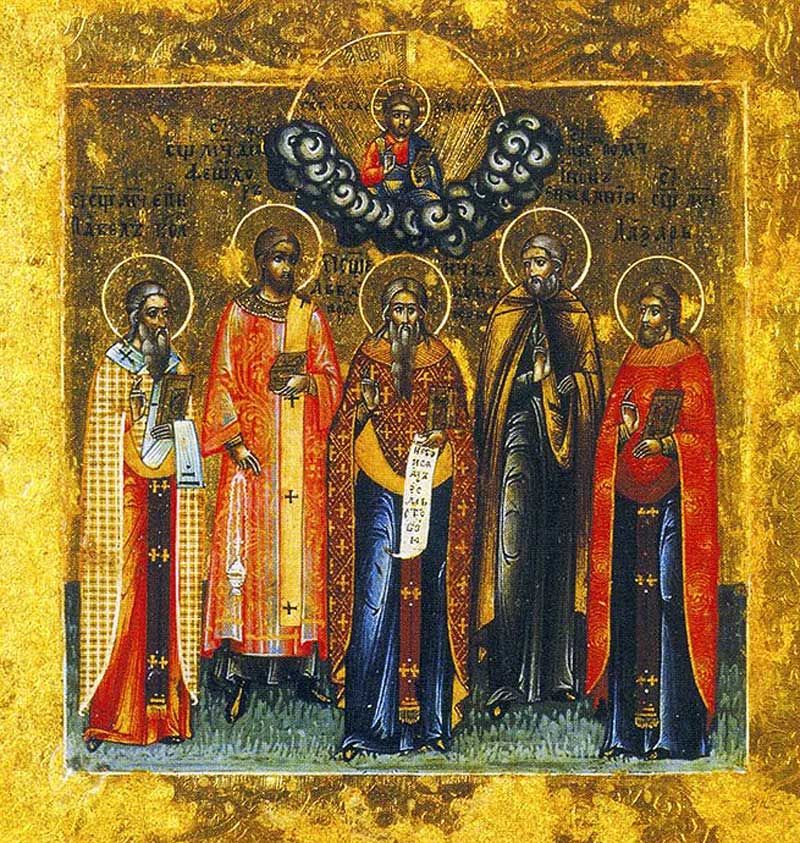 Старообрядческая икона 18 века - священномученик Аввакум со священномучениками: коломенским епископом Павлом, диаконом Феодором, инком Епифанием, иереем Лазарем