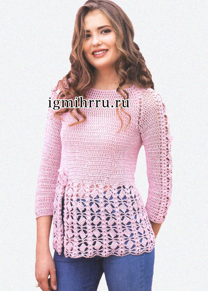 Романс в розовых тонах. Пуловер с выразительным узором из ромбов на баске и рукавах. Вязание крючком