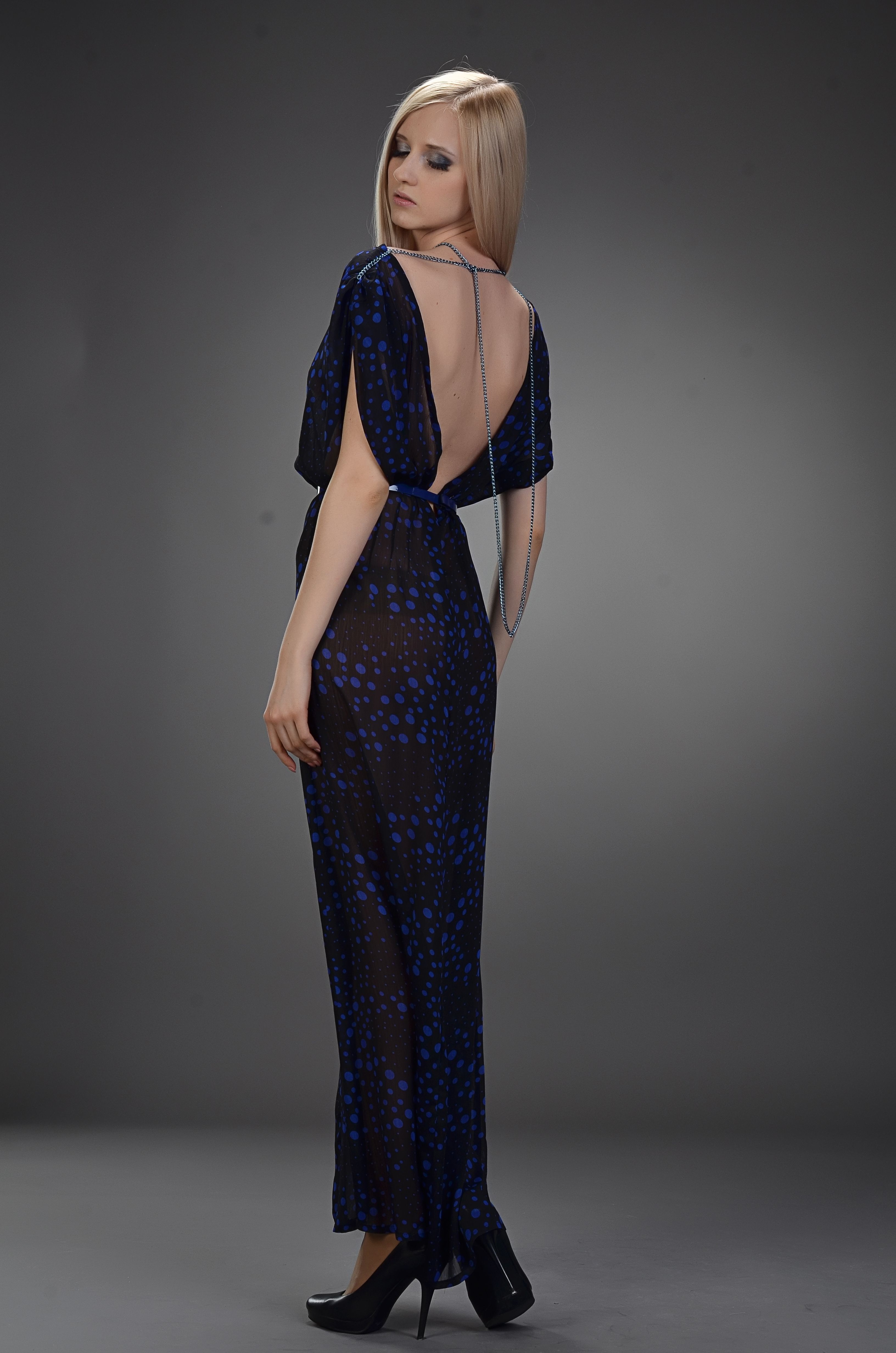 шикарное вечерне платье приталенного силуэта с приспущенным плечом и глубоким вырезом на спине, длинные цепочки можно крепить согласно вашей фантазии
