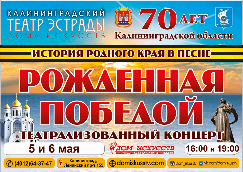 «Рождённая победой» 2016 год – год 70-летия образования Калининградской области. Этому событию посвящена премьера программы Театра эстрады Дома искусств, которая состоится 5 и 6 мая в 16.00 и 19.00. Театрализованный концерт «Рожденная Победой» - это история родного края в песне... http://www.randevu39.ru/kaliningrad-teatr/teatr-jestrady-doma-iskusstv-kaliningrad/