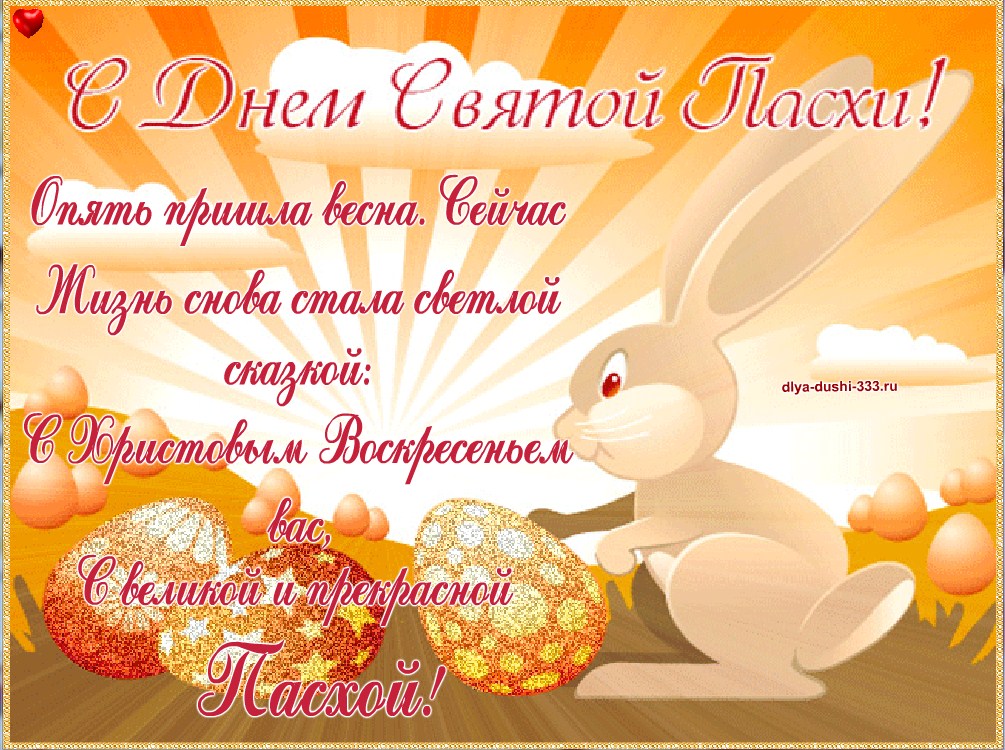С Великой Пасхой Вас! Как жаль, что вам кулич не подарить. И яйцо по телефону не отправить. Осталось лишь Христос Воскрес сказать! И луч тепла в душе оставить! С ВЕЛИКОЙ ПАСХОЙ!