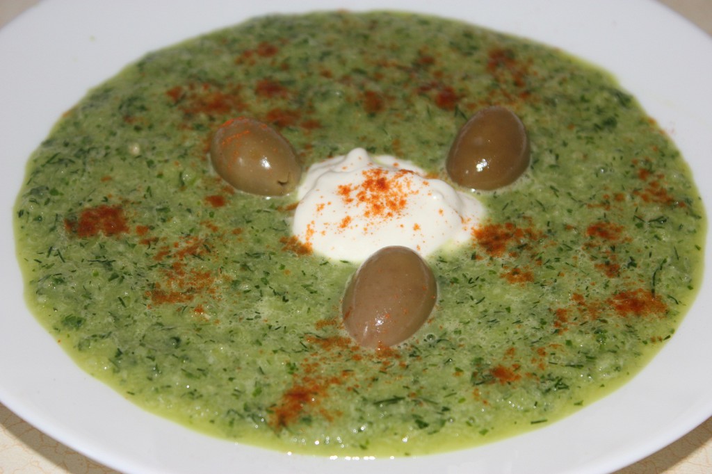 Зеленый перец, кабачок, огурец , долька чеснока, укроп, соль, перец, сок лимона, оливковое масло первого отжима, лед, йогурт.