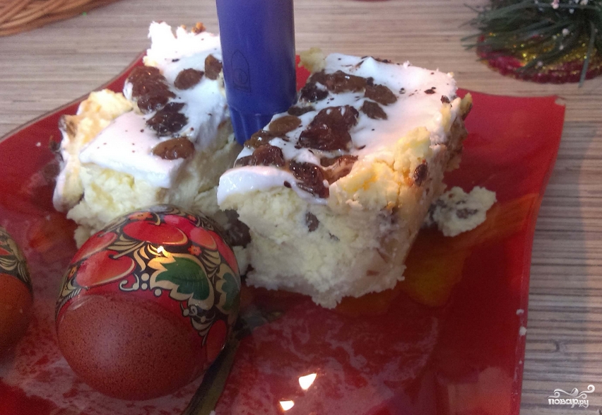 - Изюм предварительно залейте кипятком на 15 минут, чтобы он разбух. Затем просушите. Яйца разделяем на белки и желтки. Белки кладем в холодильник. Творог перетираем через сито с 200 г. сахарной пудры. Добавляем желтки, растопленное масло, сметану и ваниль. Кипятим массу на медленном огне, постоянно помешивая. Снимаем с огня, даем ей немного остыть, ставим в холодильник до полного остывания. Если масса выходит очень жидкой, заверните ее в марлю и подвесьте, чтобы стекла вся лишняя жидкость. Форму для выпечки застилаем пергаментом. Выкладываем в нее тесто. Выпекаем в духовке 50 минут при температуре 160 градусов. Взбиваем белки с оставшейся сахарной пудрой до устойчивых пиков. Покрываем кулич глазурью и украшаем изюмом. Приятного аппетита!