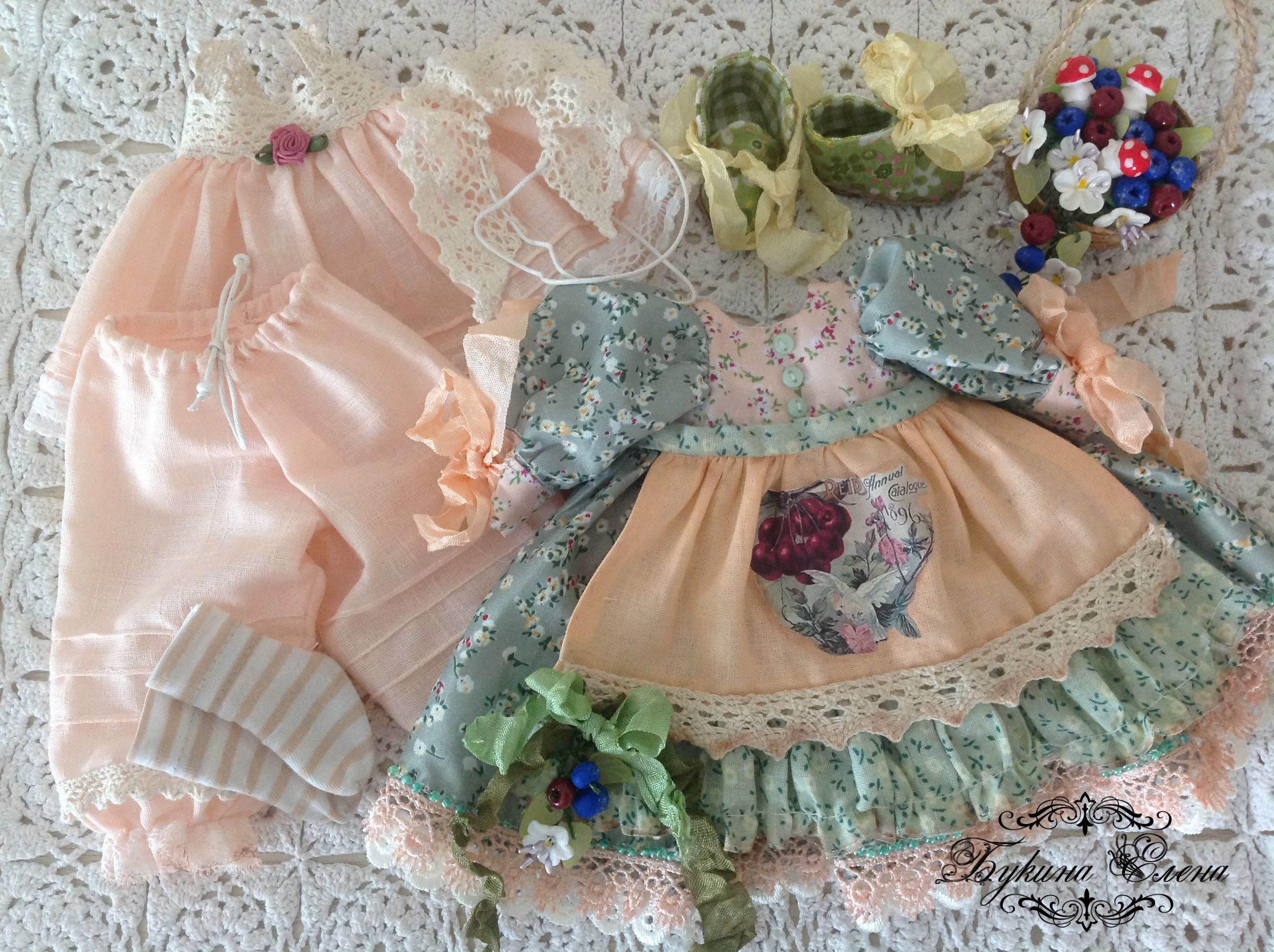 Лесная феечка Ладушка. Куколка коллекционная,текстильная . Полностью подвижная, голова крутится и немного наклоняется. Ножки сгибаются, в руках проволочный каркас, каждый пальчик гнется. Волосы натуральные овечьи кудри. Вся одежда снимается, платье отделано кружевом и бисером. На фартуке винтажная картинка, в темноте светится.Ботиночки сшиты мной. На голове заколки из полимерной глины, в руках корзинка с грибочками, цветочками и ягодками из полимерной глины.