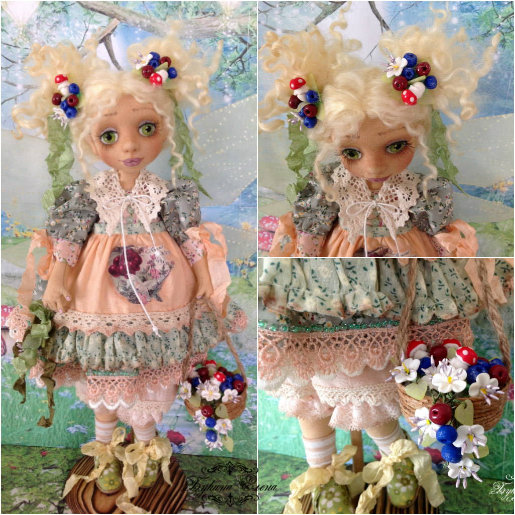 Лесная феечка Ладушка. Куколка коллекционная,текстильная . Полностью подвижная, голова крутится и немного наклоняется. Ножки сгибаются, в руках проволочный каркас, каждый пальчик гнется. Волосы натуральные овечьи кудри. Вся одежда снимается, платье отделано кружевом и бисером. На фартуке винтажная картинка, в темноте светится.Ботиночки сшиты мной. На голове заколки из полимерной глины, в руках корзинка с грибочками, цветочками и ягодками из полимерной глины.