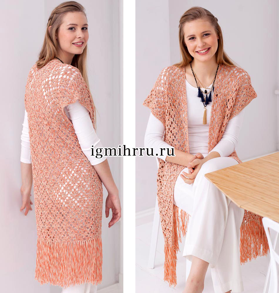 Оранжево-белый жилет с бахромой, связанный единым полотном в технике филейных ромбов. Вязание крючком