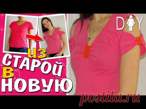 Переделка футболки своими руками. Из самой обычной футболки можно сделать красивую стильную летнюю блузу с открытыми плечами и красивой линией талии. Сделать эту футболку можно в домашних условиях без дополнительных затрат. Швейная машинка не нужна. Просто берем и переделываем на раз-два!