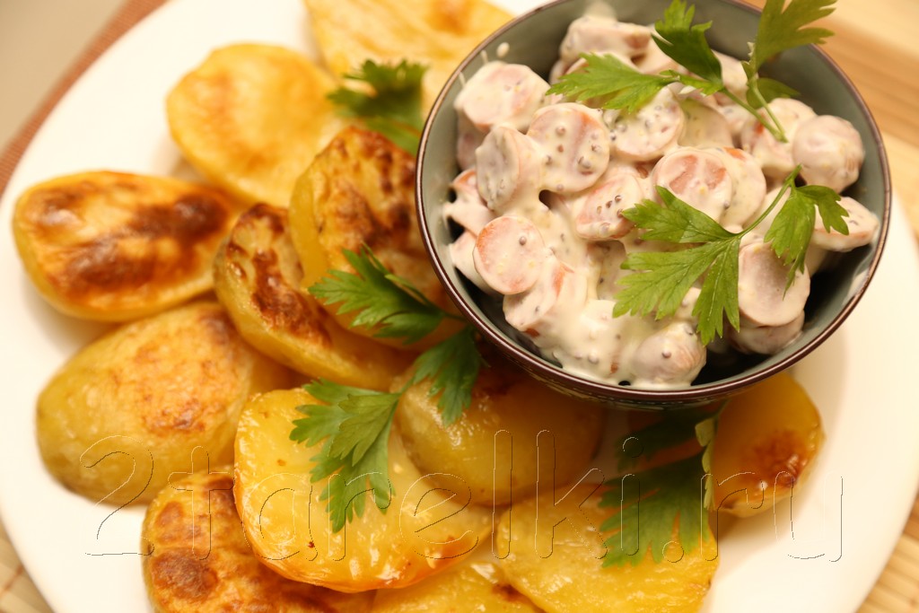 Печеная картошка с сосисками в горчичном соусе : 2 ТАРЕЛКИ | кулинария, рецепты, блюда, пошаговые фото, поиск по ингредиентам