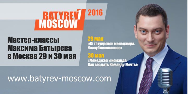 29 и 30 мая в Москве состоятся мастер-классы Максима Батырева, автора бизнес-бестселлера «45 татуировок менеджера» ( На них Максим расскажет о том, как управлять сотрудниками в нашей стране, чтобы добиваться сверхрезультатов. Мастер-классы предназначены для руководителей всех уровней, а также для тех, кто планирует занять руководящую должность. Максим Батырев является самым востребованным бизнес-спикером по прикладному менеджменту в 2015-2016 г. Его мастер-классы посетило более 17 000…