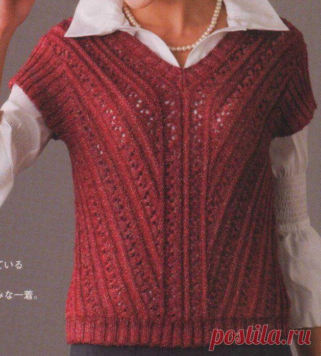 Красный жилет, связанный поперек.