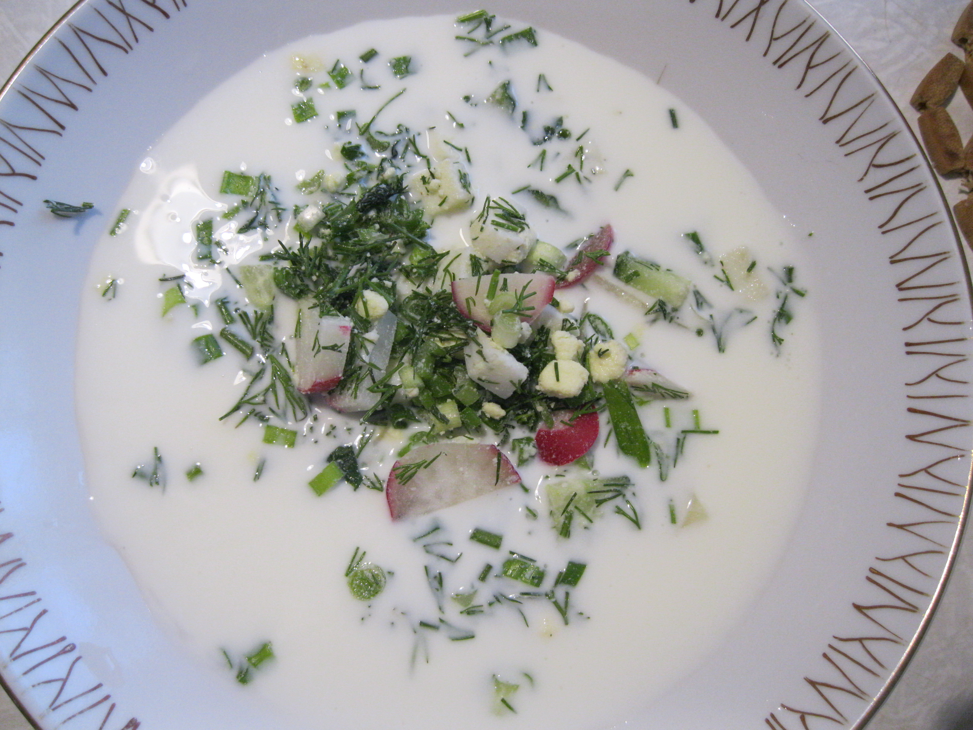 Самая вкусная и полезная окрошка. Минимум времени на приготовление. Нарезаем овощи: свежий огурец, редис, зеленый лук, укроп, петрушка, вареные яйца, картофель. Солим и перчим по вкусу, заливаем кефиром. Можно айраном или сывороткой. А так же окрошки на огуречном расоле, квасе.
