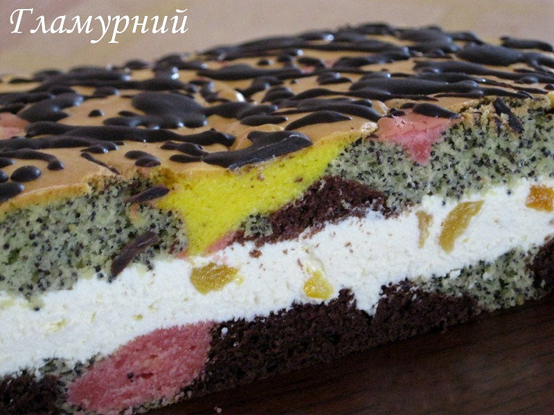 Пляцок ГЛАМУРНИЙ Інгредієнти:Ф-24*36 Корж: 10 білків 5 жовтків 1,5 скл. цукру 1,5 скл. борошна 1 п. порошку до печива 1 скл. олії крім того для І-1 ст. л какао ІІ-5 жовтків,1 ст.л борошна ІІІ-5 ст.л маку сухого ІV-1 пач.червоного кисілю Крем: 300 г масла 0,5 б сирої згущонки 300 г домашнього сиру 200 г кураги 1 п. ван. цукру. Корж: Білки добре збити з цукром,додати жовтки,борошно з порошком,олію.Поділити тісто на 4 частини,до кожної додати окремі інгредієнти. Форму для випічки застелити пергамен
