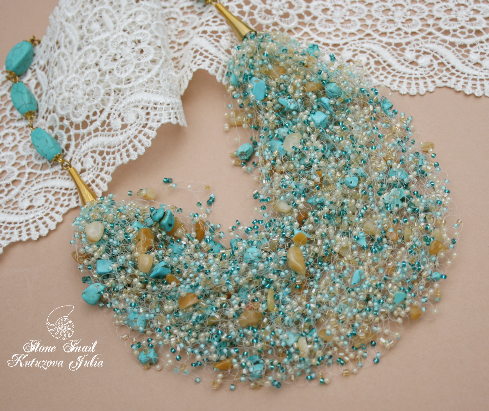 колье из чешского бисера и рубки. Использованы камешки бирюзы и кальцитаДлина около 50 см. Есть цепочка- удлинитель