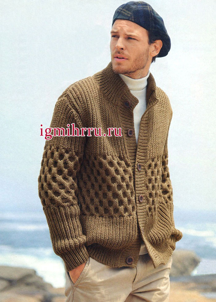 Неформальный стиль. Коричневый мужской жакет с фантазийной резинкой и рельефным узором. Вязание спицами для мужчин