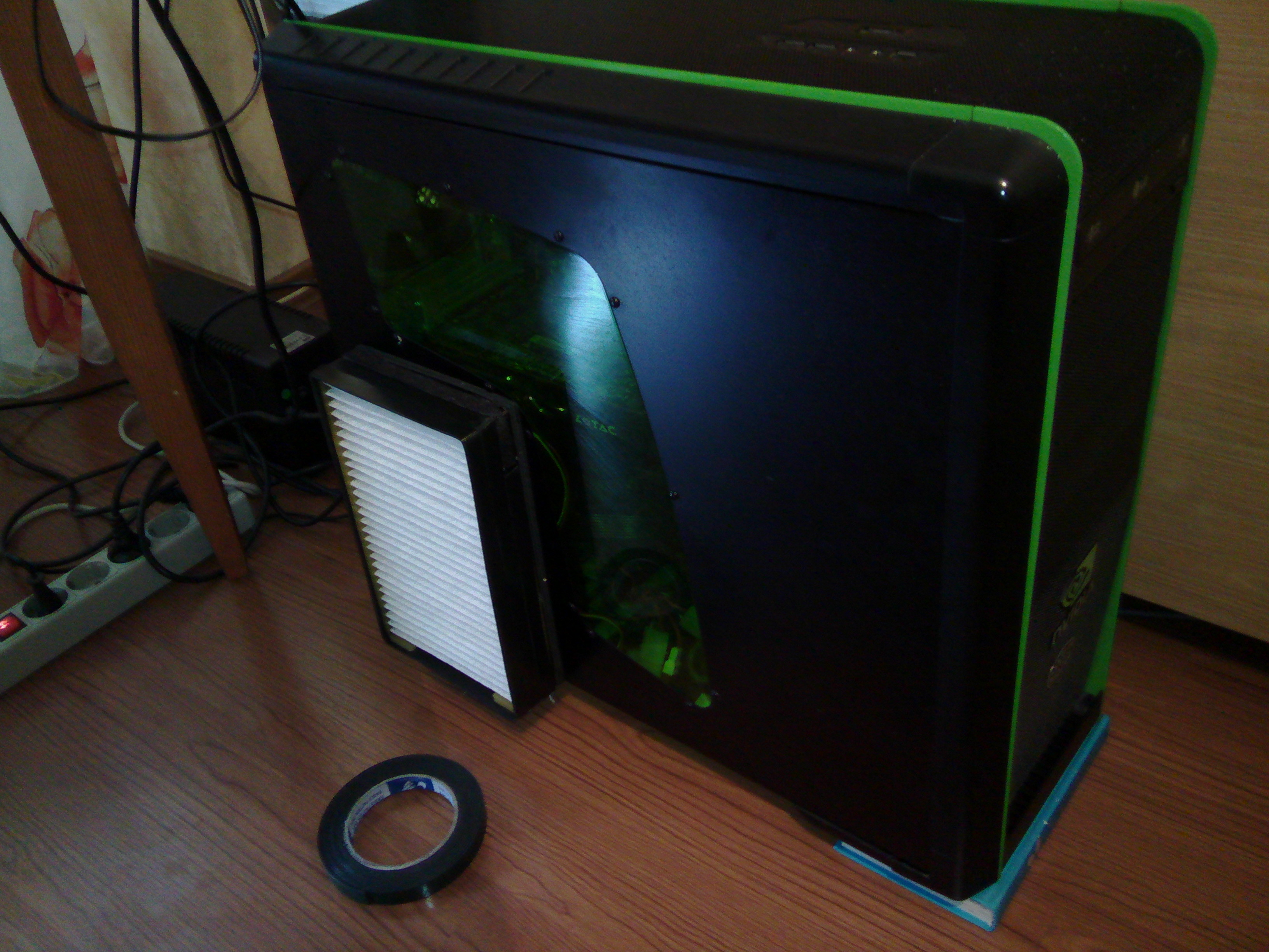 Фильтр для компьютера. Купил фильтр печки ВАЗ. Фильтр ФЭС-310. С помощью 2-х стороннего скотча толщиной 2мм, в 4-ре слоя приклеил к боковой стенке компьютера. Там вентилятор 120мм, производительностью 1,218м3/мин. Для него по хорошему надо фильтр с площадью поверхности 0,4м2. У фильтра ФЭС-310 площадь примерно 0,28м2. Фильтр особенно нужен для производственных помещений.