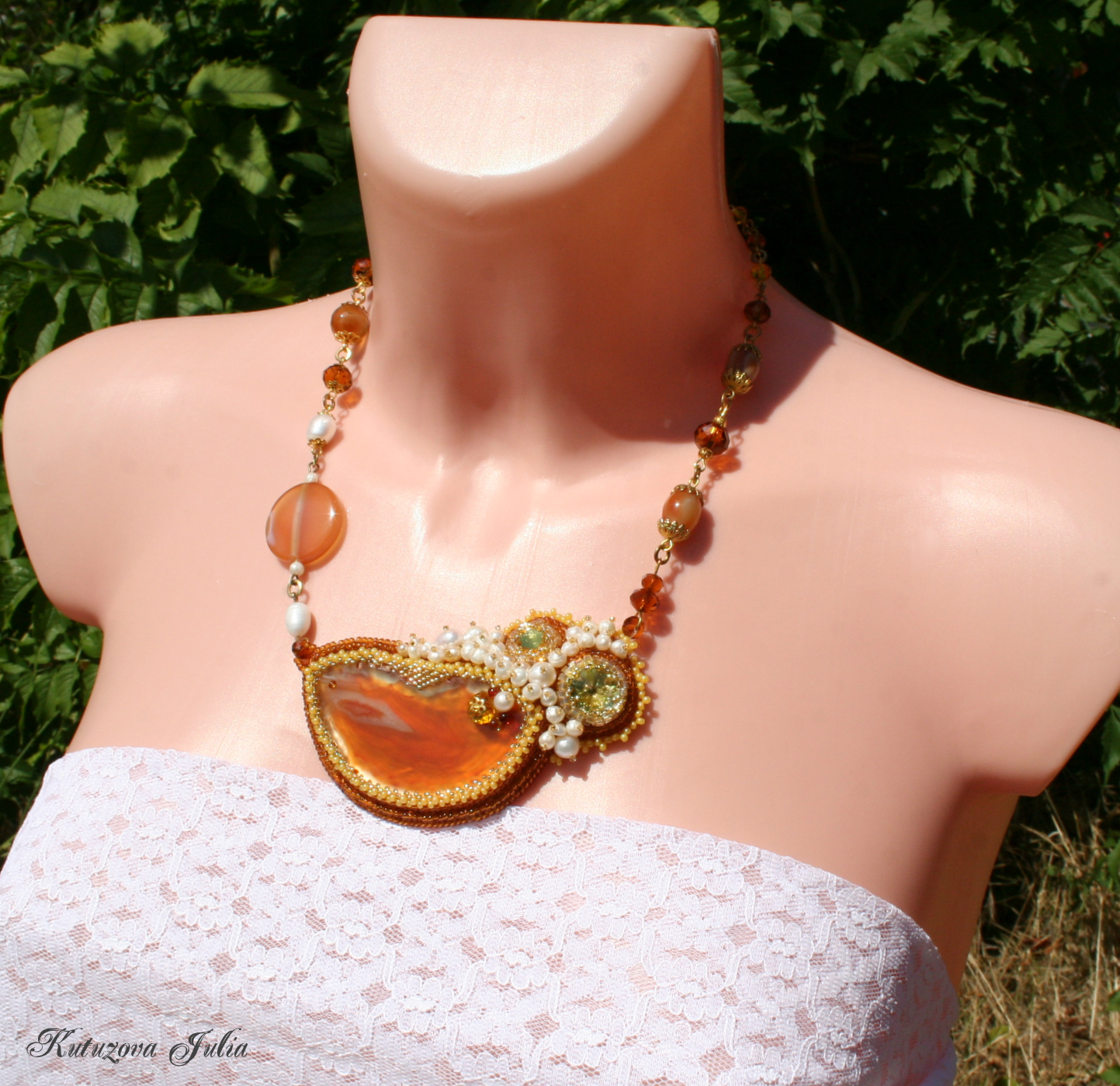 колье "Солнечное" агат,стразы,жемчуг, бусины., чешский и японский бисер. Размеры: вышитого элемента около 10х6см; Длина по меньшей стороне около 48см