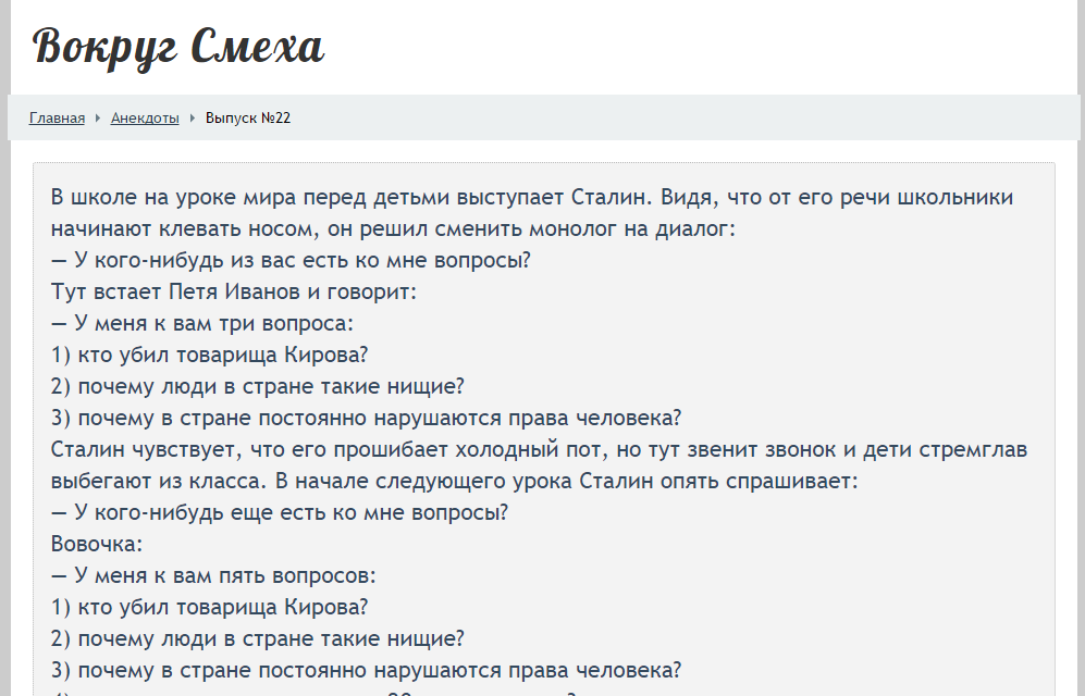 В школе на уроке мира перед детьми выступает Сталин. Видя, что от его речи школьники начинают клевать носом, он решил сменить монолог на диалог: — У кого-нибудь из вас есть ко мне вопросы? Тут встает Петя Иванов и говорит: — У меня к вам три вопроса: 1) кто убил товарища Кирова? 2) почему люди в стране такие нищие? 3) почему в стране постоянно нарушаются права человека? Сталин чувствует, что его прошибает холодный пот, но тут звенит звонок и дети стремглав выбегают из клас...