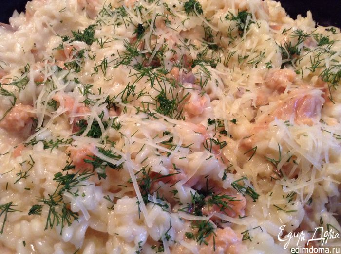 - На весь экран # шаг 11/11Добавить семгу в ризотто, еще раз все перемешать, снять с огня, присыпать укропом и оставшимся пармезаном. поделиться фото 4.5согласны?