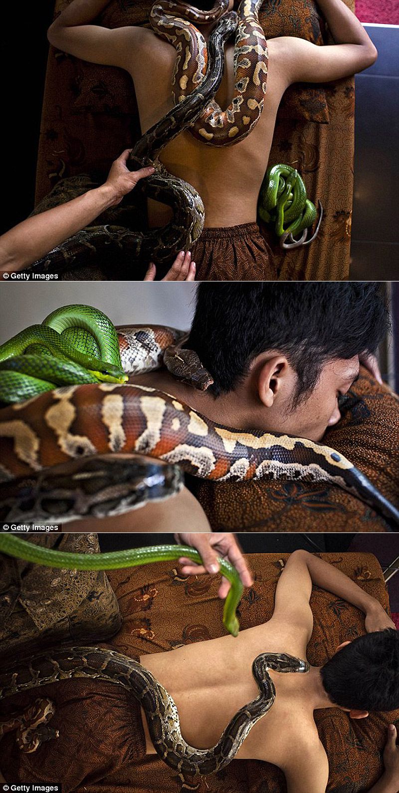 В Израиле есть массаж змеями. Крупные рептилии своим весом разминают суставы и мышцы пациента, а мелкие снимают стресс и успокаивают.