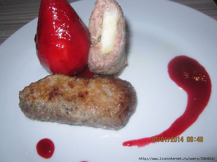 Рулетики из говядины с грушей Груши вымыть, очистить от кожицы, разрезать каждую на 4 части. Удалить сердцевину. Выложить груши на тарелку, посыпать тертым пармезаном, мускатным орехом, чуть присолить и оставить на 15 мин. 2. Мясо ( можно птицу, свинину )разрезать на порции, как следует отбить. Посолить ,поперчить.Положить в середину каждого куска по одной дольке груши. Свернуть в рулет, перевязать.