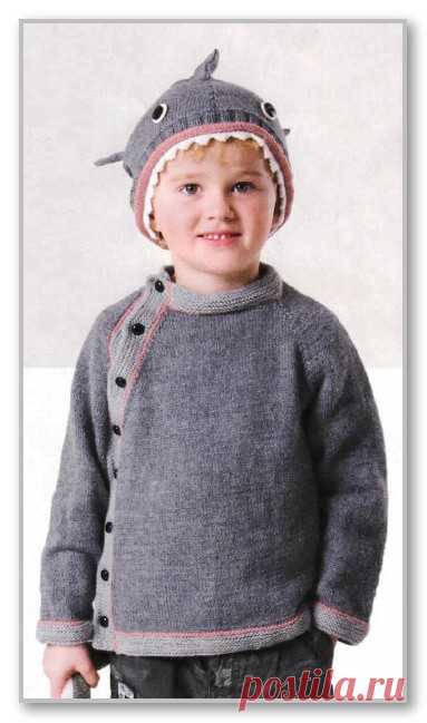 Вязание детям спицами. Фотогалерея моделей для детей от 0 до 3 лет. Пуловер-реглан с боковой застежкой и шапочка-Акула, для мальчика 1 (2, 3, 4) года