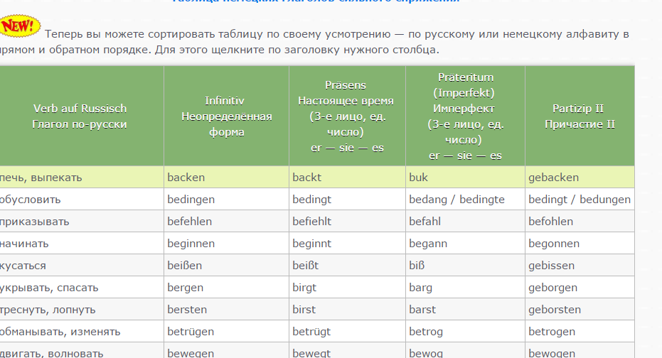 Таблица немецких глаголов сильного спряжения — неправильные глаголы