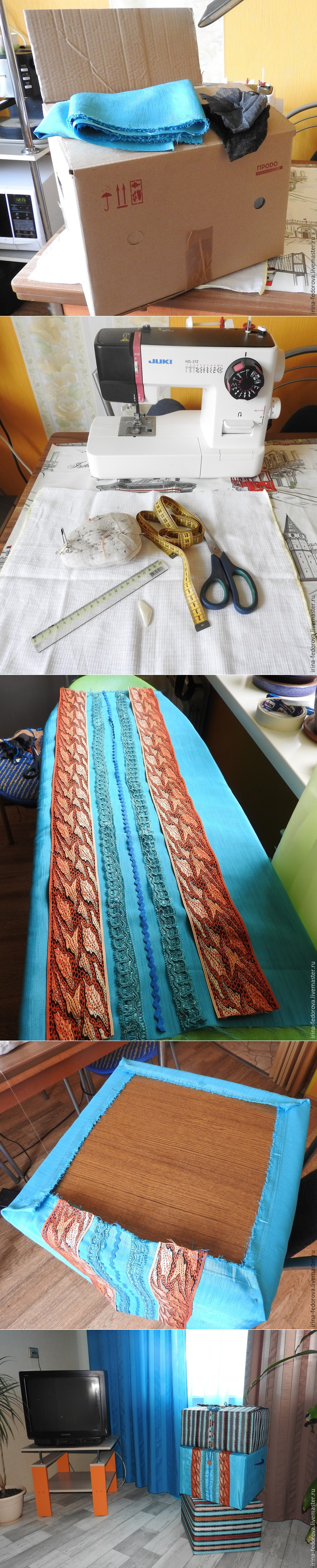 Как сделать декоративный короб для интерьера и хранения вещей Вам понадобится: 1. Шнурок. 2. Коробка. 3. Клеевая ткань. 4. Любая ткань в цвет вашего интерьера. 5. Тесьма жаккардовая. 6. Тесьма витая. 7. Декоративный цветочек. 8. Скотч. 9. Нож канцелярский. 10. Обои на липкой основе. 11. Пуговица. 12. Линейка. 13. Метр. 14. Ножницы. 15. Мел. 16. Булавки для скалывания ткани. 17. Швейная машинка. Некоторые материалы вы можете смело пропустить или заменить тем, что есть у вас дом