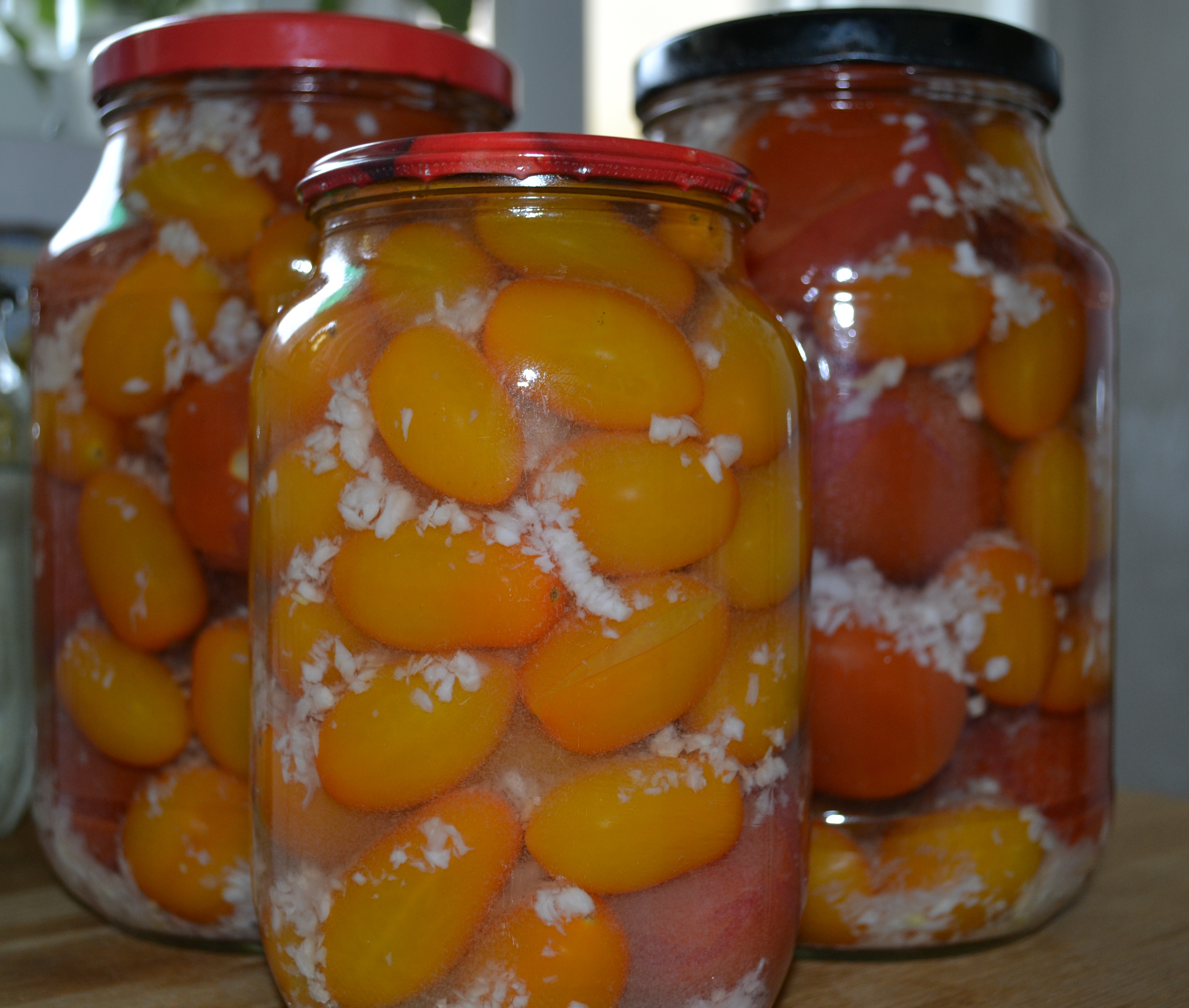 Помидоры с чесноком на зиму. В пору домашних заготовок каждая хозяйка хочет найти или уже нашла свой рецепт консервированных, соленых или маринованных помидоров. Для вас рецепт помидоров с чесноком «под снегом» на зиму. Называется еще этот рецепт заготовки «Помидоры под снегом», «Помидоры в снегу», по вкусу они напоминают помидоры в собственном соку, потому что привкус уксуса и чеснока совсем не чувствуется. Продукты Помидоры Рассол (на 1,5 литра воды): 100 г сахара