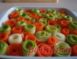 Красивая овощная запеканка Ингредиенты: Кабачок молодой — 1 шт. Морковь крупная — 1 шт. Помидор — 2 шт. Яйцо — 3 шт. Сметана ( у меня 15 % ) — 100 г Сыр твёрдый — 50 г Чеснок ( по желанию ) — 3 зубчика Соль Приготовление: 1. Кабачок и морковь нарезать тонкими полосками при помощи овощечистки. Помидоры нарезать кружочками. 2. Каждую полосочку кабачка и моркови скрутить рулетиком. Выложить рулетика в шахматном порядке в форму для запекания ( у меня квадратна...