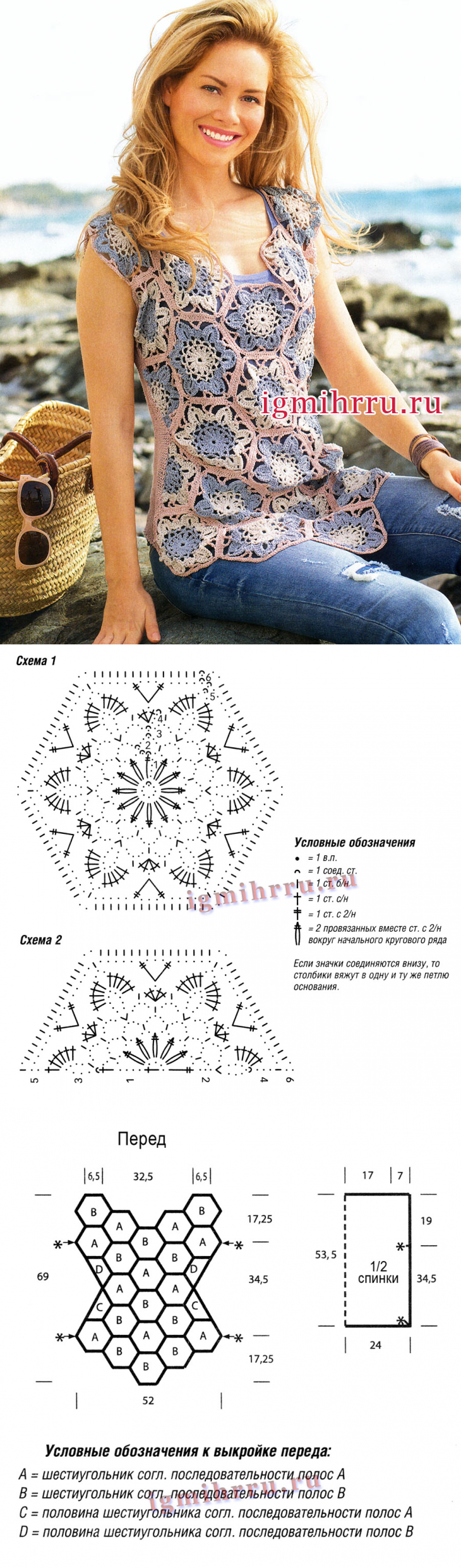 Летний топ с крупными цветочными мотивами. Вязание крючком и спицами