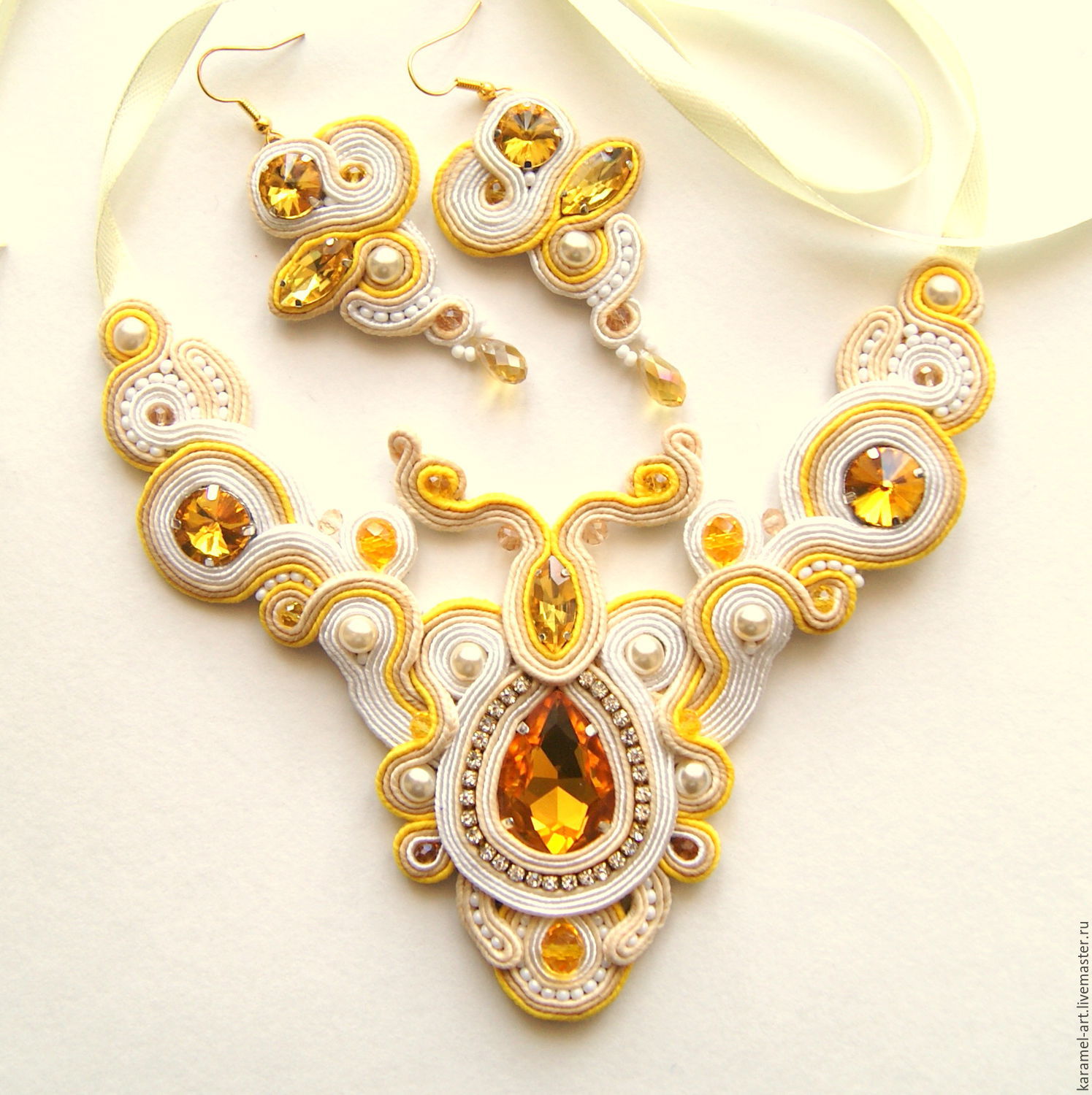 Купить Комплект Бродвей - желтый, белый, бежевый, украшения ручной работы, украшения со стразами