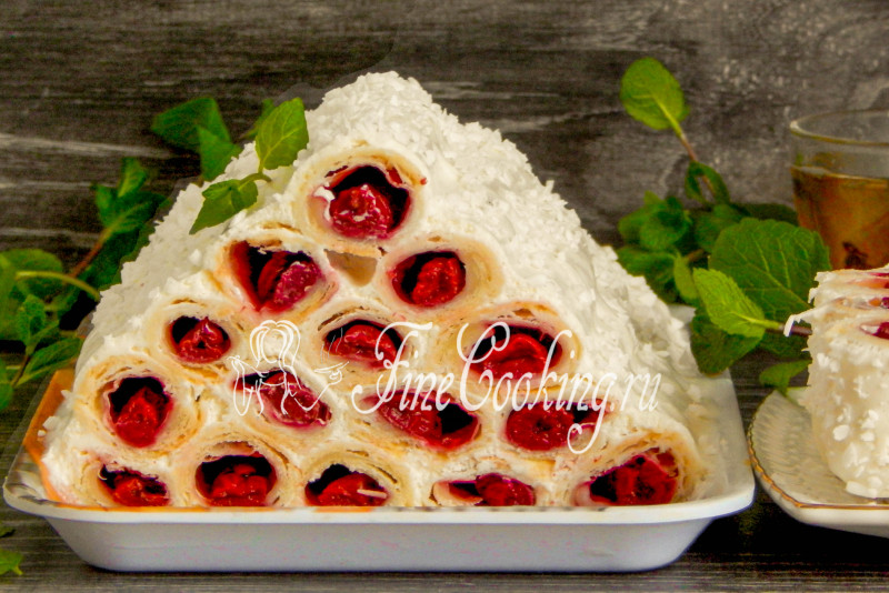 - В рецепт торта Монастырская изба входят простые и вполне доступные ингредиенты: вишня без косточек, пшеничная мука высшего сорта, сметана, сахарная пудра, сливочное масло, соль и ванилин. Для украшения готового десерта можно использовать кокосовую стружку (мне такой вариант очень нравится) или шоколад (растопленный или рубленый). Кроме того, можно полить торт шоколадной глазурью - это дело вкуса.