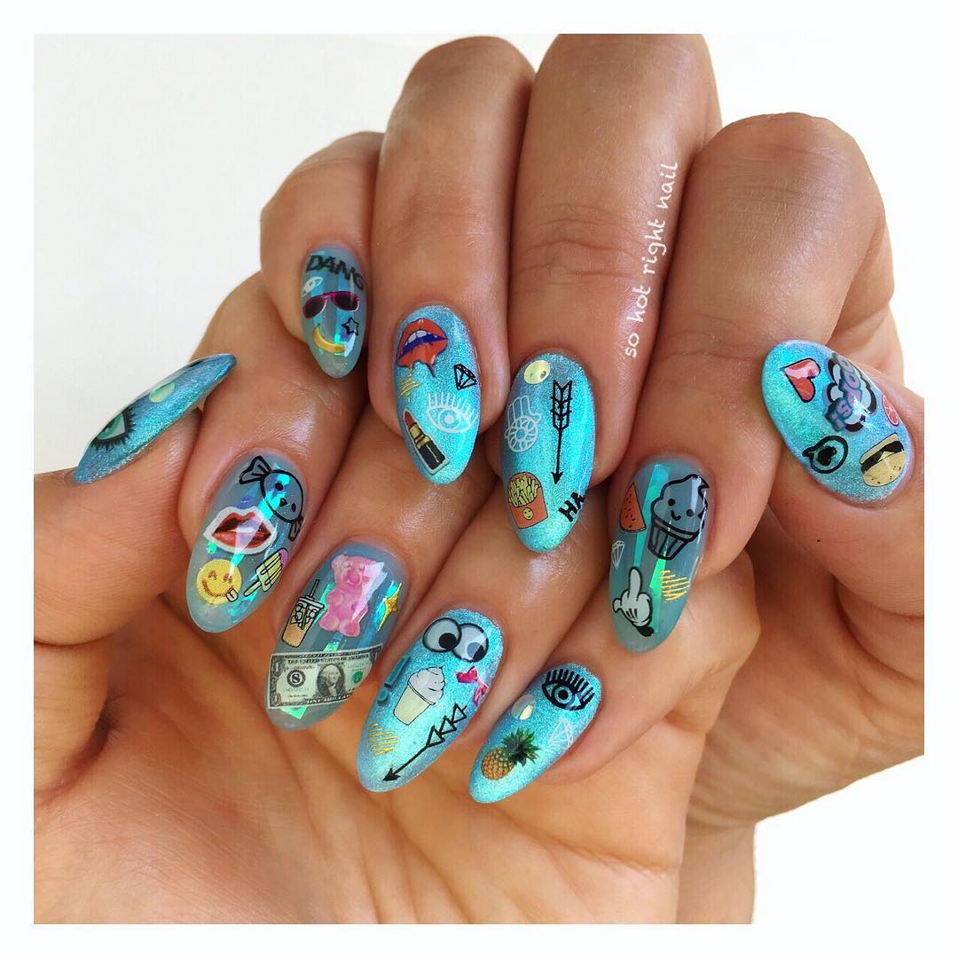 SO HOT RIGHT NAIL on Instagram: “blue kawaii for @ari_hairstylista 💅👀👄💄🕶🍌🎀🍦🍬💎💵❤️🍟🍍🍔🖕😋 | using a selection of decals from @hexnailjewelry @wiinoshop @nocturnalpaper & @shanail_usa 🙌”